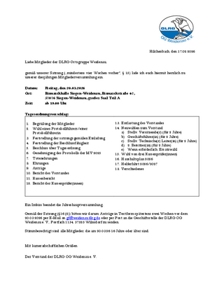 Gemäß der Satzung (§16 (2)) bitten wir darum, Anträge in Textform spätestens zwei Wochen vor dem 20.03.2026 per E-Mail an gf@weidenau.dlrg.de oder per Post an die Geschäftsstelle der DLRG OG Weidenau e. V., Postfach 1134, 57225 Wilnsdorf zu senden.