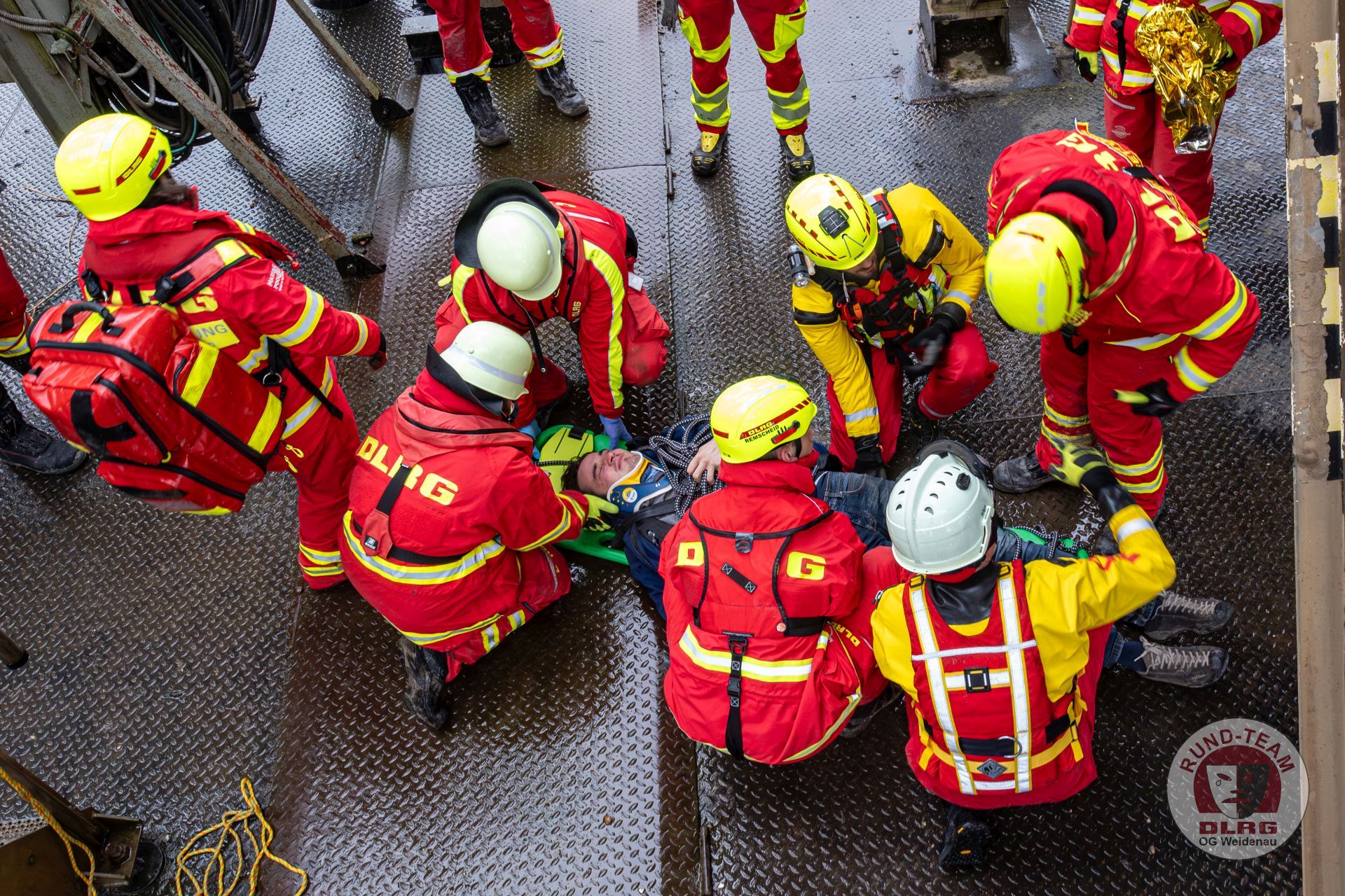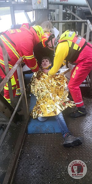 Durch den Ruck beim Auflaufen des Schiffe auf Grund stürzten 2 weitere Besatzungsmitglieder und erlitten einen Beinbruch bzw. eine Wirbelsäulenverletzung. Nach der Erstversorgung der Patienten mussten die eingesetzten DLRG-Rettungskräfte auch den schonenden Transport über diverse steile und enge Treppen von höhergelegenen Bühnen bzw. Räumen unter Deck weiter auf die Rettungsboote und dann an das sehr matschige/sandige Ufer durchführen.