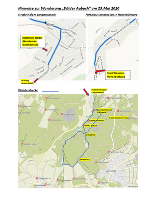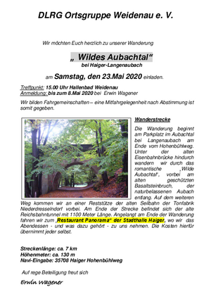 Leider muss aufgrund der Corona-Lage auch die für den 23.05.2020 geplante Wanderung "Wildes Aubachtal" abgesagt werden.