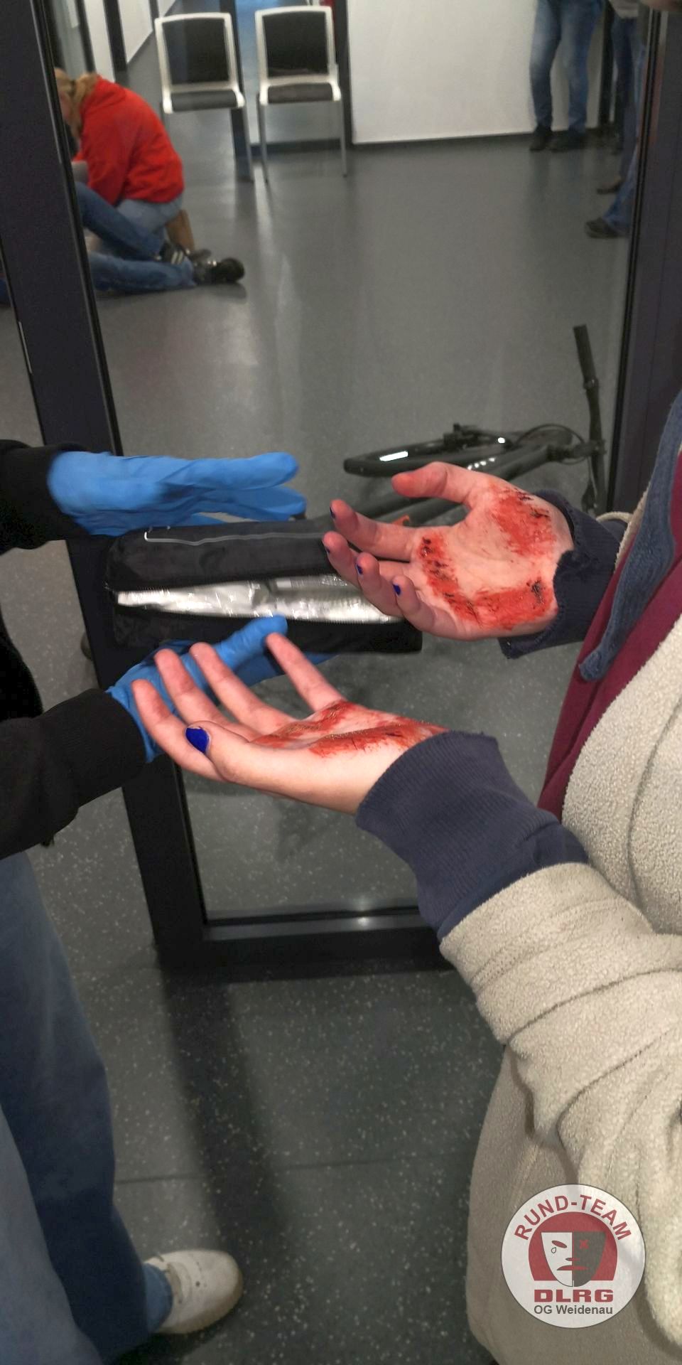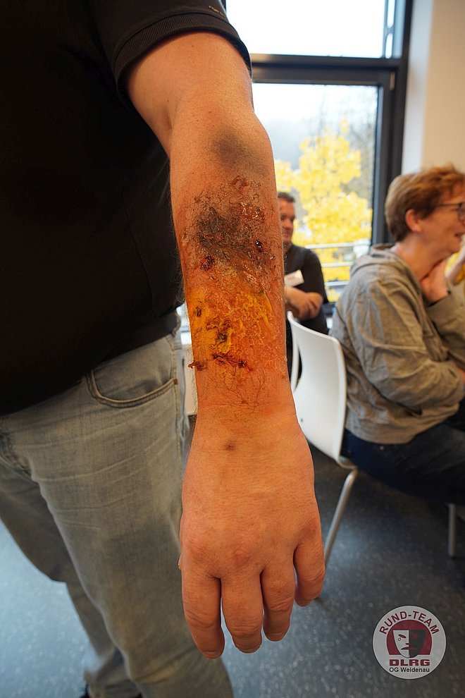 Neben der möglichst realistischen Darstellung verschiedener Verletzungen mit unterschiedlichesten Schminkmaterialien erläuterten unsere 3 RUND-AusbilderInnen auch verschiedene Sicherheitsmaßnahmen und schauspielerische Grundlagen, die bei der Darstellung zu beachten sind. In vielen kleineren praktischen Übungen konnten die TeilnehmerInnen die erlernten Kenntnisse dann direkt selber ausprobieren.