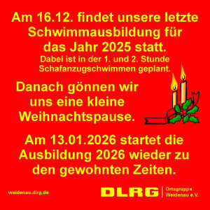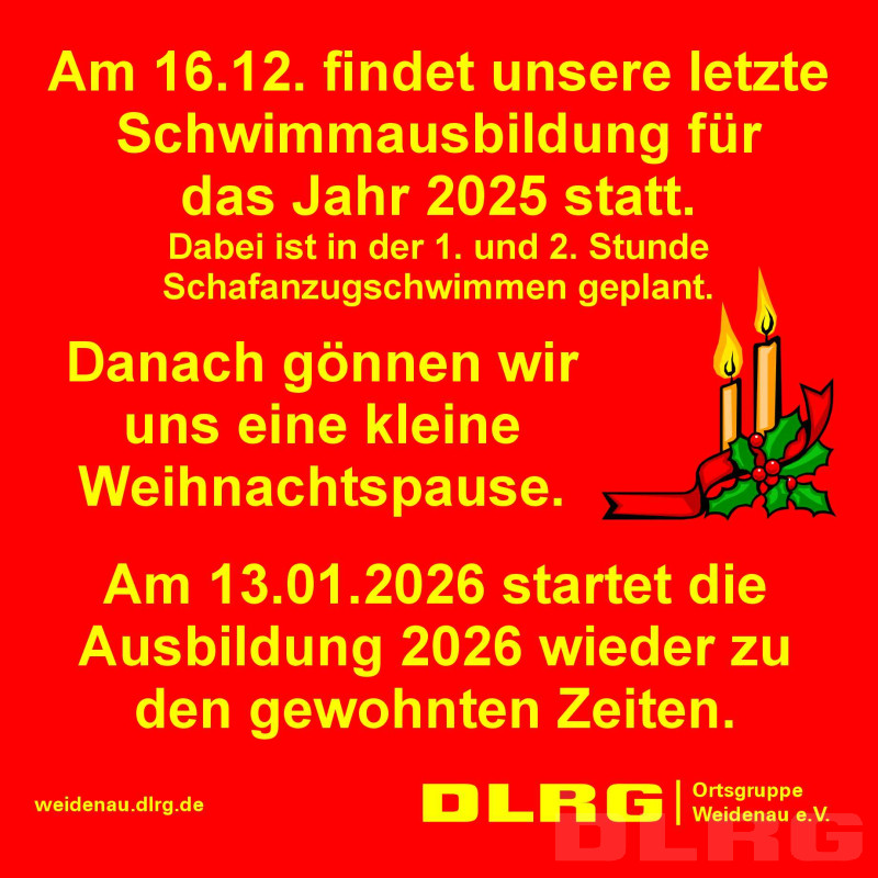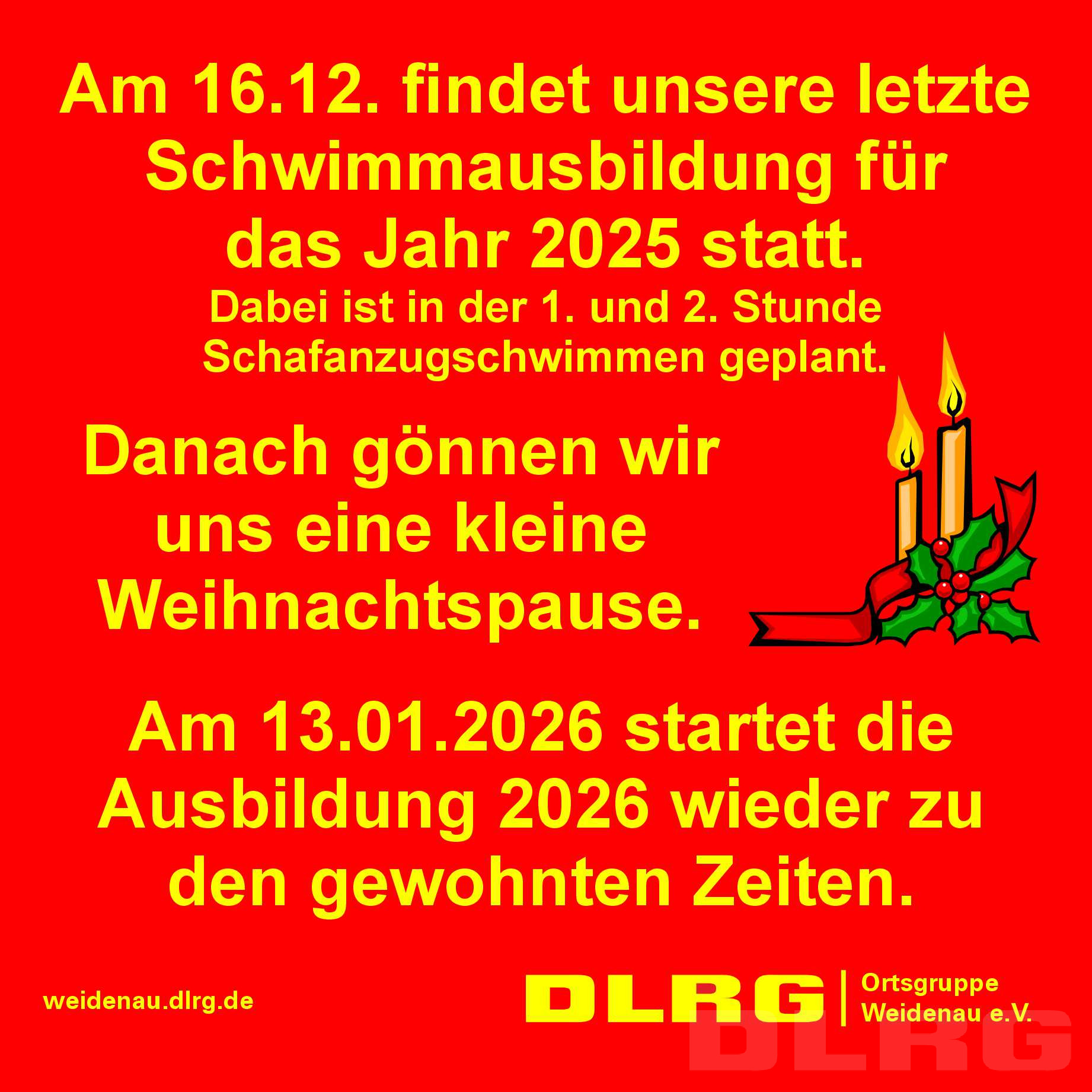 Im neuen Jahr geht es dann ab dem 13.01.2026 zu den gewohnten Zeiten mit der Schwimmausbildung weiter.
